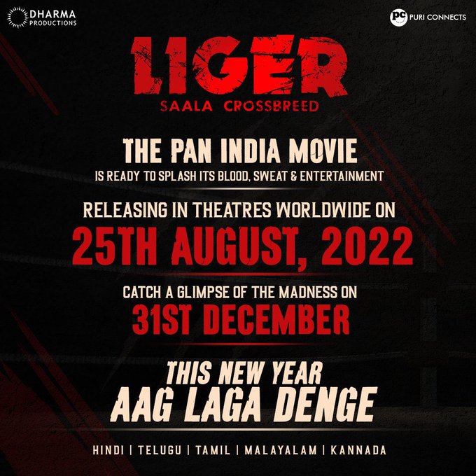 Vijay Deverakonda, and Bollywood actress Ananya Panday are working for an action and romantic film Liger which will be released in theatres on 25th August, 2022 Hindi, Telugu, Tamil, Malayalam and Kannada. The film’s first glimpse will hit the web on 31st December. The makers of Liger confirmed the same today morning by releasing a new poster on Twitter.