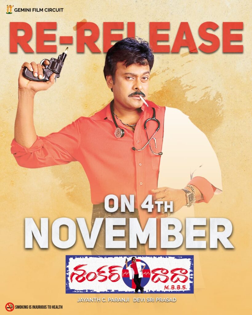 అసలే ఇప్పుడు నాటి కల్ట్ క్లాసిక్ సినిమాలను రీ రిలీజ్ చేస్తున్నారు. టాలీవుడ్లో ఎక్కువగా రీ రిలీజ్ల ట్రెండ్ నడుస్తోన్న సంగతి తెలిసిందే. ఈ క్రమంలో మెగాస్టార్ చిరంజీవి ఎవర్ గ్రీన్ బ్లాక్ బస్టర్ అయిన శంకర్ దాదా ఎంబీబీఎస్ సినిమాను రీ రిలీజ్ చేసేందుకు సర్వం సిద్దమైంది. నవంబర్ 4న ఈ చిత్రాన్ని గ్రాండ్గా రిలీజ్ చేసేందుకు ప్లాన్ చేశారు.