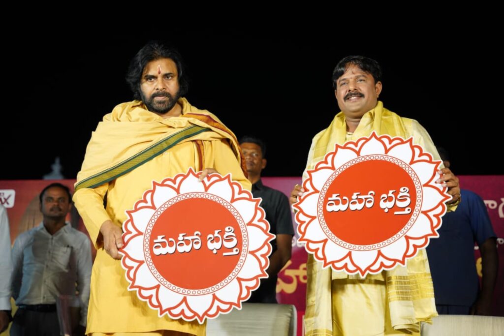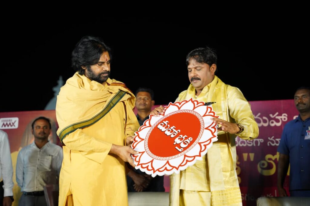 ‘ఆ భగవంతుడు ఆదేశించారు. ఈ మహా వంశీ పాటిస్తున్నారు. మహా కుంభమేళా ఆఖరి రోజున, మహా శివరాత్రి పర్వదినాన, మహాశివ జాగరణ సమయంలో, మహా రుద్రాభిషేకాన్ని నిర్వహిస్తూ, మహాలింగోద్భవ కార్యక్రమాన్ని కొనసాగిస్తూ, మహా శివపార్వతుల కళ్యాణంతో పాటు ‘మహా భక్తి’ లోగో ఆవిష్కరణ కార్యక్రమానికి, శుభ ప్రారంభానికి విచ్చేసినటువంటి సనాతన ధర్మ పరిరక్షకుడు, ఆంధ్ర ప్రదేశ్ రాష్ట్ర ఉపముఖ్యమంత్రి వర్యులు పవన్ కళ్యాణ్ గారు రావడం .. మహా గ్రూప్ చేసుకున్నటువంటి ఎన్నో జన్మల పుణ్యఫలం. మహా గ్రూప్ నుంచి మహా న్యూస్, మహా మ్యాక్స్ అనే రెండు ఛానల్స్ కొనసాగుతున్నాయి. ఇప్పుడు మహా భక్తి పేరుతో మూడో ఛానల్ ఆవిష్కరణ జరుగుతోంది. ఈ మహాభక్తి ఛానల్ ని సనాతన ధర్మం కోసం పోరాటం చేస్తూ.