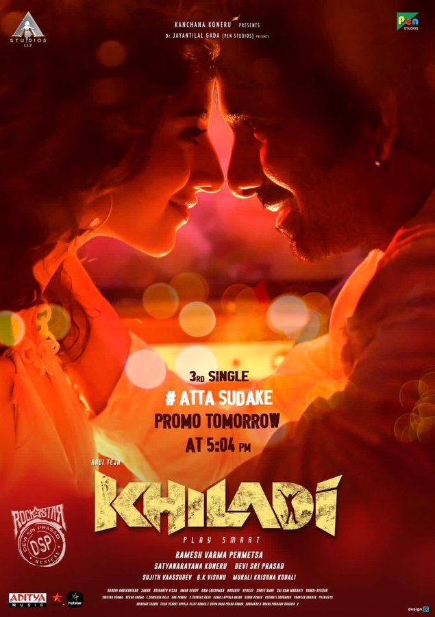 Directed by Ramesh Varma, the thriller film Khiladi has Mass Maharaja Ravi Teja in the lead role. The movie  will be released on 11th February, 2022. Ravi Teja is playing dual role in this actioner that has Dimple Hayathi and Meenakshi Chaudhary in the female leads role. Today evening the makers of Khiladi officially confirmed that the promo of 4th single Atta Sudake from Khiladi will be out tomorrow at 5:04 pm whereas the full song will be out on 31st December.