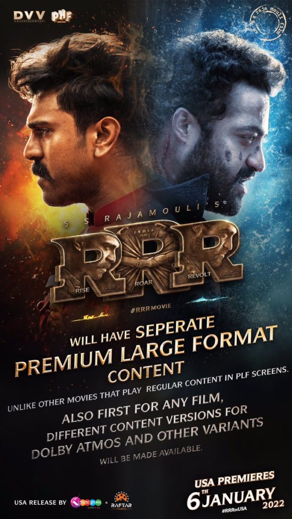 The makers of RRR have sent two different versions of the same film for screenings in the USA. RRR statement reads: Rajamouli’ RRR will have separate Premium Large Format Version Content unlike other movies that play regular content in PLF screens. As a first for any film, different content versions for Dolby Atmos & other variants will be made available. RRR Premiers on 6th June in USA.