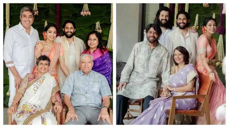 నాగచైతన్య- నటి శోభితా ధూళిపాళ్ల నిశ్చితార్థం గురువారం గ్రాండ్గా ఎంగేజ్మెంట్ జరిగింది. దీంతో ఫ్యాన్స్ పెళ్లి ఎప్పుడు..శోభిత ఫ్యామిలీ ఎక్కడ అంటూ ప్రశ్నలు సంధించడం మొదలుపెట్టారు. ఈ క్రమంలో ఇరు ఫ్యామిలీల పిక్స్ షేర్ చేసి అందరి ప్రశ్నలకు చెక్ పెట్టారు. తాజాగా బయటకు వచ్చిన ఫోటోలలో అక్కినేని అమల, అక్కినేని నాగార్జున, నాగ చైతన్య, అఖిల్, శోభిత కలిసి దిగిన ఒక ఫోటో సోషల్ మీడియాలో చాలా వైరల్ గా మారుతుంది.